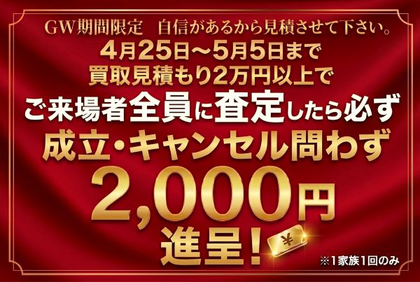 店頭査定はもちろん、出張査定でも宅配査定でもお値段が合わなければすべて無料となりますのでご安心下さいませ。